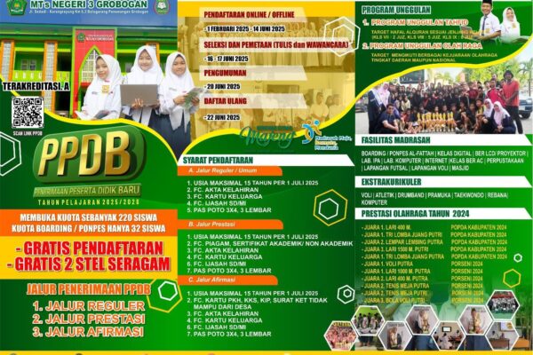 Grobogan — MTs Negeri 3 Grobogan kembali menunjukkan komitmennya dalam meningkatkan kualitas keagamaan siswa dengan meluncurkan program baru yaitu Bimbingan BTA (Baca Tulis Al-Qur’an). Program ini resmi dimulai pada bulan Juli 2025 dan akan dilaksanakan secara rutin setiap hari Rabu pagi sebelum kegiatan belajar mengajar dimulai. Program ini menyasar seluruh peserta didik dari kelas VII…